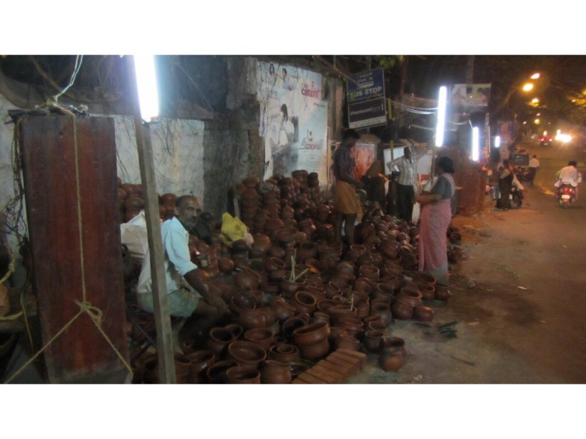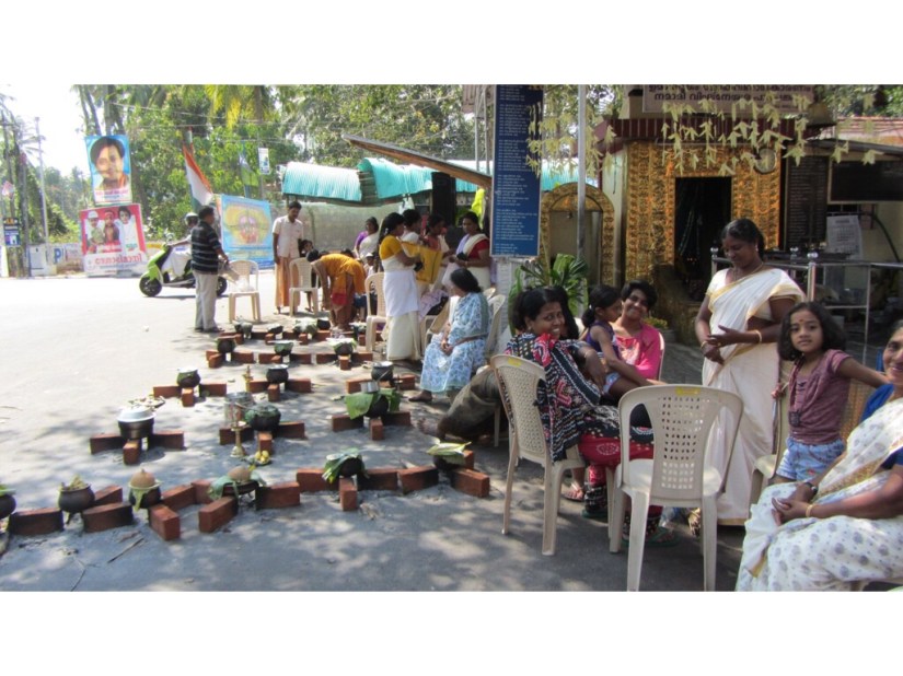 We took the train and arrived at a very busy Trivendrum station, incredibly busy, with lots of women everywhere, and while we were waiting for a tuk-tuk, the girl in front of us told us that the next day was a festival, the Attukala Pongala, which attracted women from all over Kerala, with over 3 million expected! We went into town for our last dinner in India and a final bottle of Sula wine, only to find it was another dry day because of the Pongala! Afterwards the tuk tuk driver took us to see the preparations for the festival. Women were starting to line the streets with hearths made from the bricks and kindling, topped with a clay pot to be used to cook rice pudding …