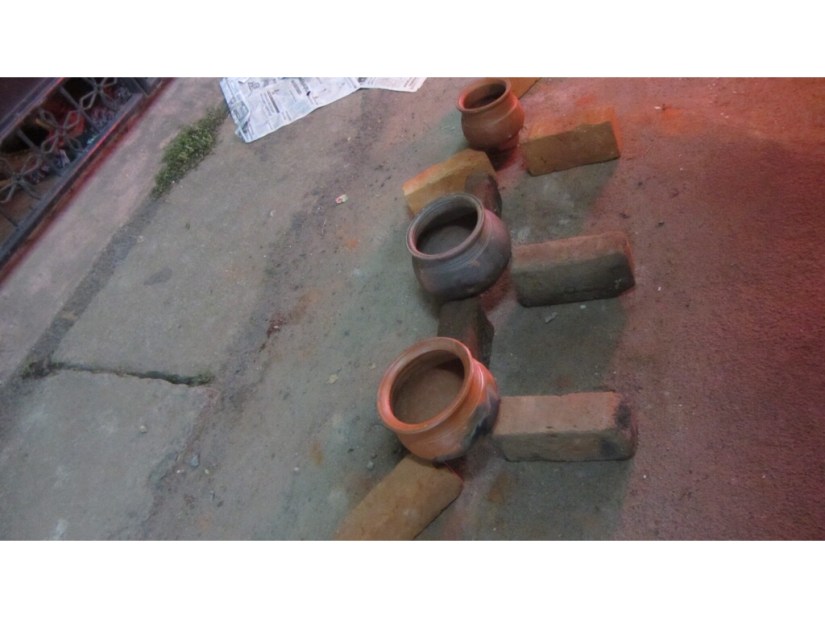 Earlier, the priest had lit the hearth in the temple, then the fire was transferred to all the women’s hearths where they cooked their rice. Now they were waiting for the priests to bring holy water and sprinkle it on the puddings which sanctifies the offering to the goddess. Finally the priest arrived, firecrackers went off, and the pots were blessed.