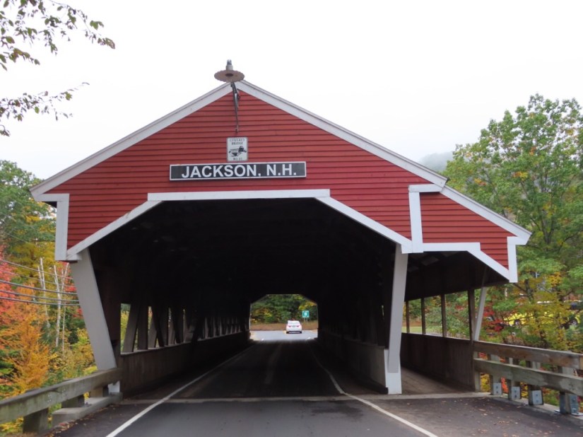 When we got down, the weather, was possibly more miserable than when we went up so we ditched the idea of an afternoon hike and lunched on last night’s leftover pizza and an apple in the car looking at the cloudy mountain. Refusing to be completely beaten by a bit of drizzle, we went to photograph the another covered bridge, Honeymoon Bridge in Jackson, built in 1876. This one was still open to traffic so taking pictures was harder, and it had a pedestrian walkway on one side.