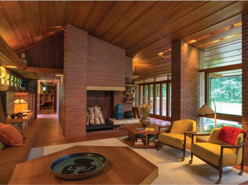 Wright believed in designing structures that were in harmony with humanity and the environment, a philosophy he called organic architecture. He was the pioneer of what came to be called the Prairie School with its horizontal lines, flat roofs with broad eaves and integration into the landscape. Later he scaled these ideas down into more modest low cost housing he called Usonian homes. It was just such a home he designed for Dr Isadore and Lucille Zimmerman in 1952.