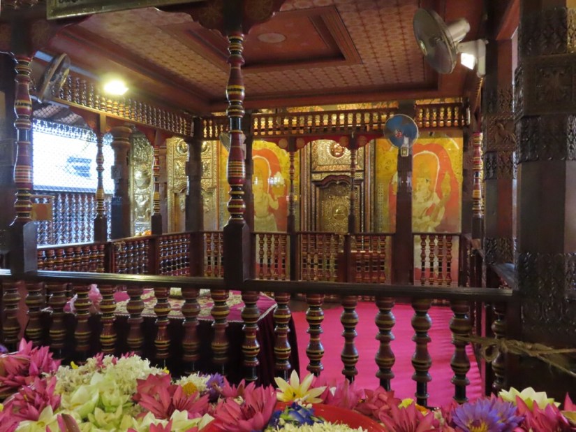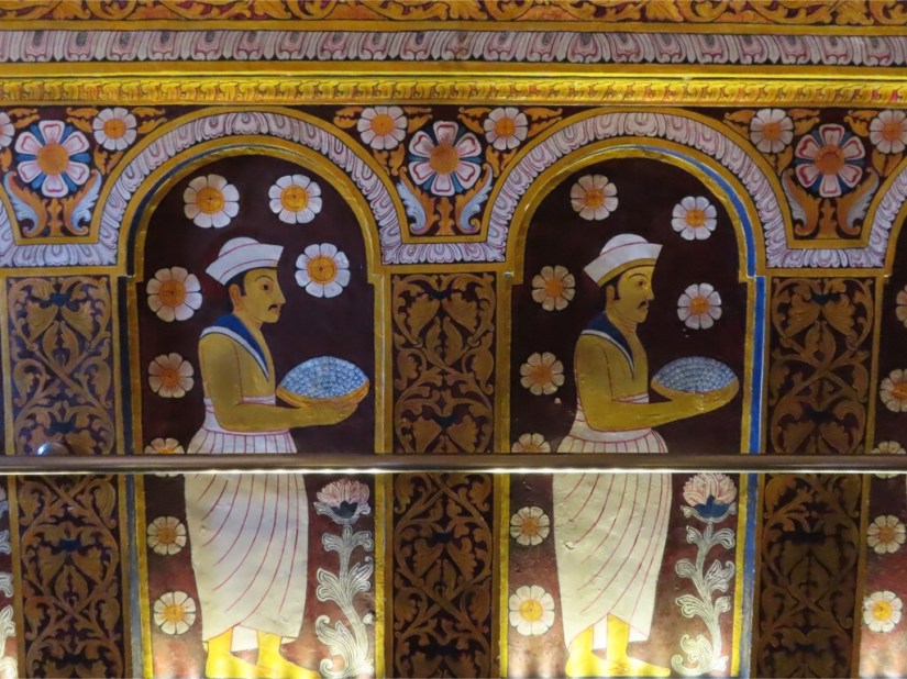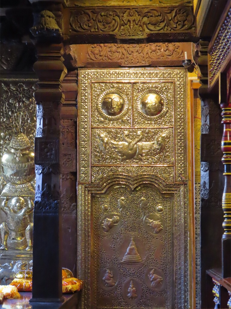 The present temple dates from C18th and this is the entrance to the Chamber with an ornate doorway embossed with suns, moons, entwined geese and dwarfs holding urns of plenty. We waited and when the puja began, we could hear drumming from downstairs, and the door were opened. The queue slowly filed by to get a glimpse of the stunning casket containing the tooth and leaving offerings.