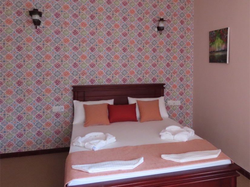 We decided to take a chance on the local bus but got a tuk-tuk to the bus station so we could guarantee seats and get our luggage stowed. The journey took about 4hrs, but the seats were comfy enough and the open windows and door gave a breeze. There were cheerful tunes playing all the way, and every time we braked, a row of shrines at the front lit with flashing lights! Hawkers got on, sold their wares and got off at the next stop but before long there was little standing room left. And the price of the ticket … 203 rupees each or 88p!