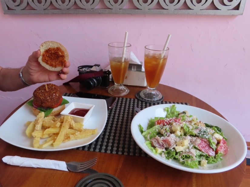 Making our way out and collecting our shoes, we headed for a seat on the breezy verandah of the Empire Cafe to indulge in a change from curried fare! I chose the Empire Salad with gotukola (pennywort), basil, lettuce, grated coconut, tomato, caramelised onion, nuggets of paneer, and golden Vada I (dhal fritters) with mustard and coconut milk dressing … and Chris opted for the Kingdom burger and fries with ginger iced tea … perfect fusion for those missing familiar food!