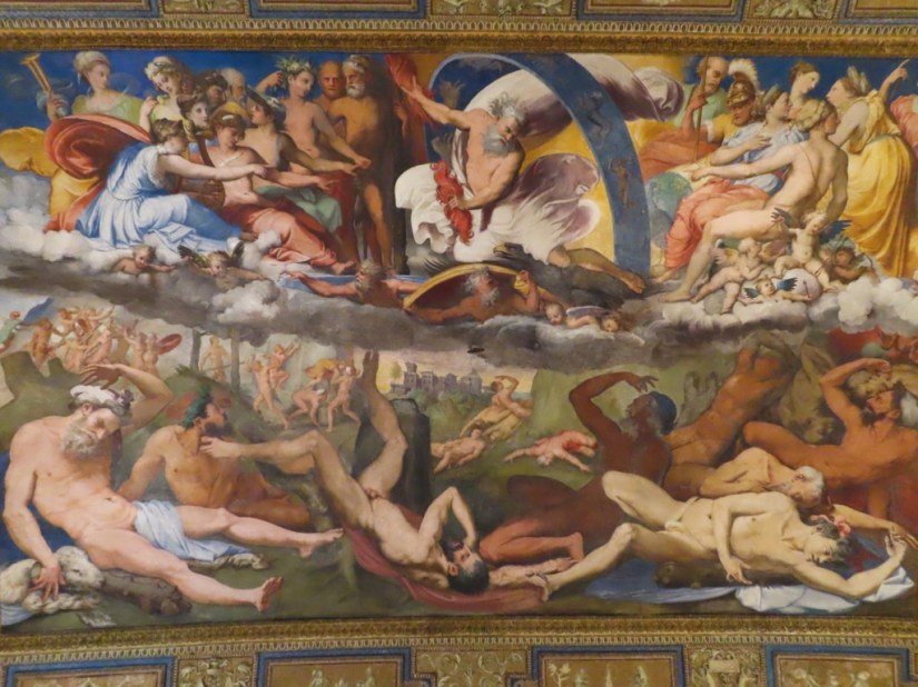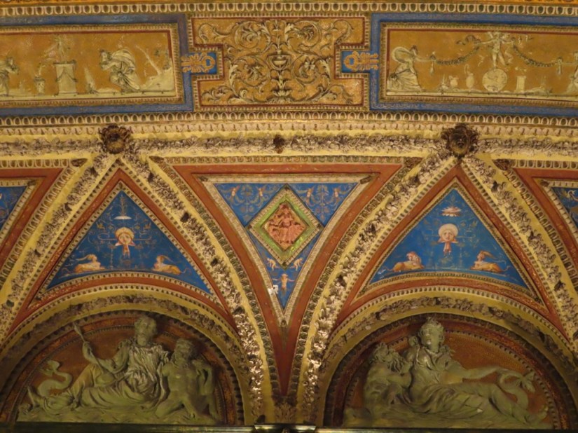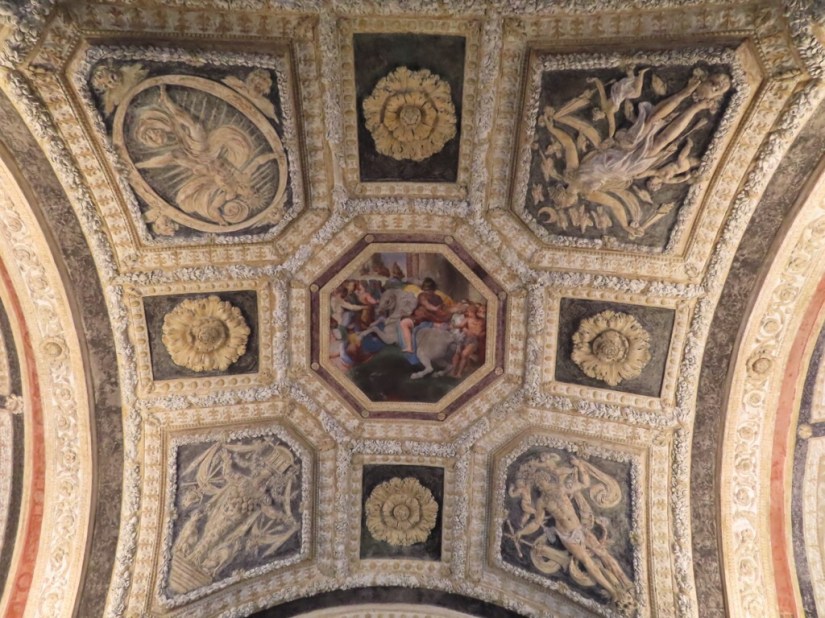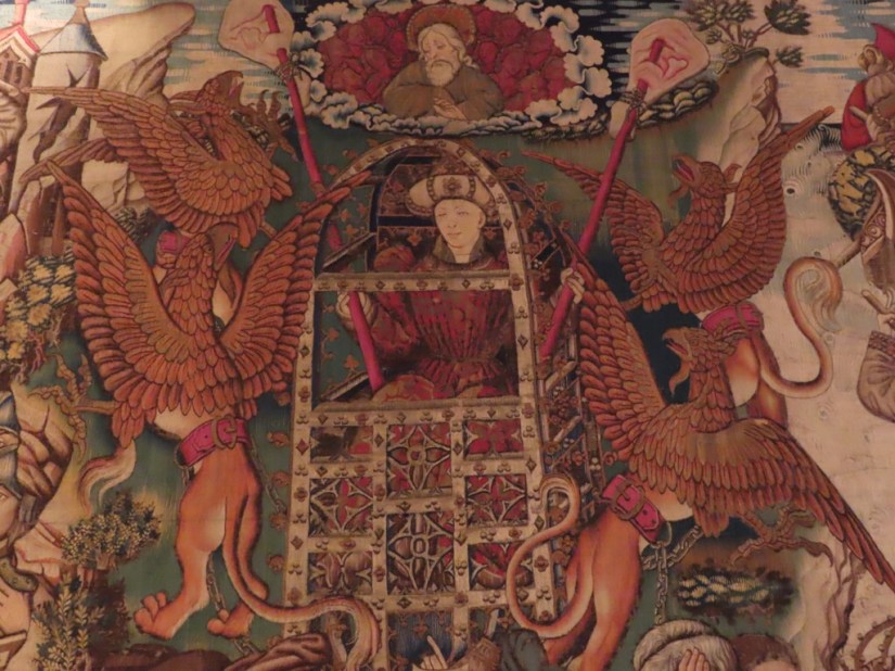 The Hall of Giants, named for the ceiling fresco also contained tapestries showing stories from the life of Alexander the Great including his horse Bucephalus and being carried aloft by griffins.