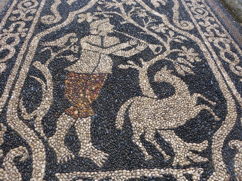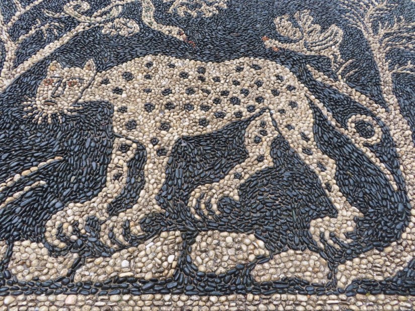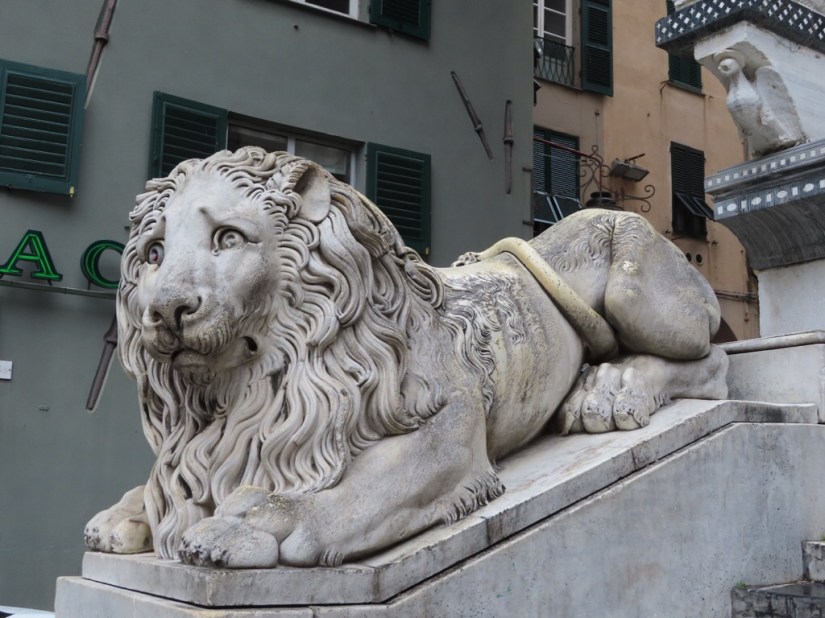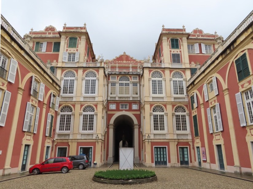 Next was Palazzo Reale, rebuilt in the Baroque style for the Durazzo family in C18th and used as a royal palace by the House of Savoy who ruled Italy between Unification in 1861 and the Republic in 1946. It is sumptuous, filled with gilding, rich fabrics, furniture and art. The hall of mirrors and the throne room say it all! Outside is a courtyard containing a fountain, set in a lovely a Ligurian pavement … the elephant and cheetah being the stars!
