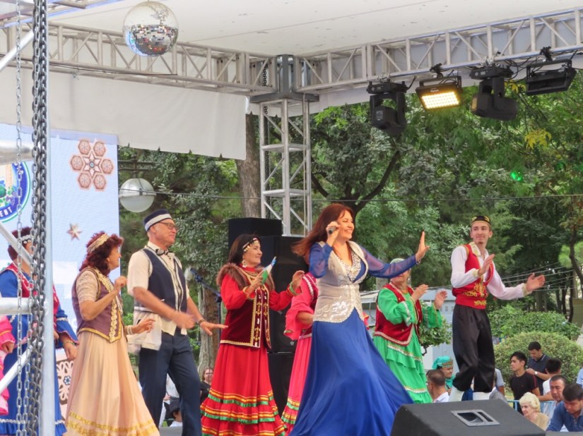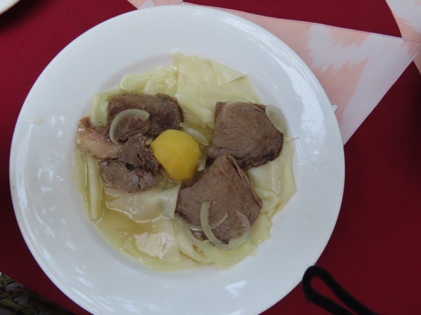 We’ve tried three restaurants – Jumani, Caravan for Uzbek food and Gruzinskiy Dvorak with a Georgian menu – and eaten well in all of them. We’ve begun our meals with various mezze and salads then Chris has dined on tofu, vegetable stew, cheese filled pastries and vegetable kebab. I’ve had a traditional Georgian dish of lamb stew with tomatoes and aubergines, spicy chicken with mushrooms and walnuts and also Beshbarmak, a national dish of nomadic Turkic peoples in Central Asia, with sheets of pasta, stewed horsemeat and a broth with sliced onions which was surprisingly delicious.