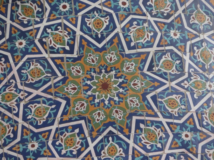 They built the Kukeldash Madrasa or Islamic School, which had fallen into disrepair, but is now restored and back in use as a college for the study of Islam. The exterior has large Iranian-style iwan gates flanked by two levels of miniature iwan with pointed arches and small minaret-like towers called guldasta. Stylistically, apparently all madrasas in Uzbekistan are similar, whatever their age, although they can be decorated differently, and here there are lots of colourful majolica tiles.