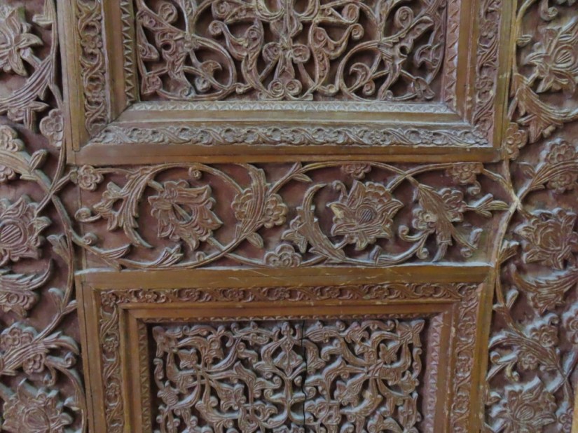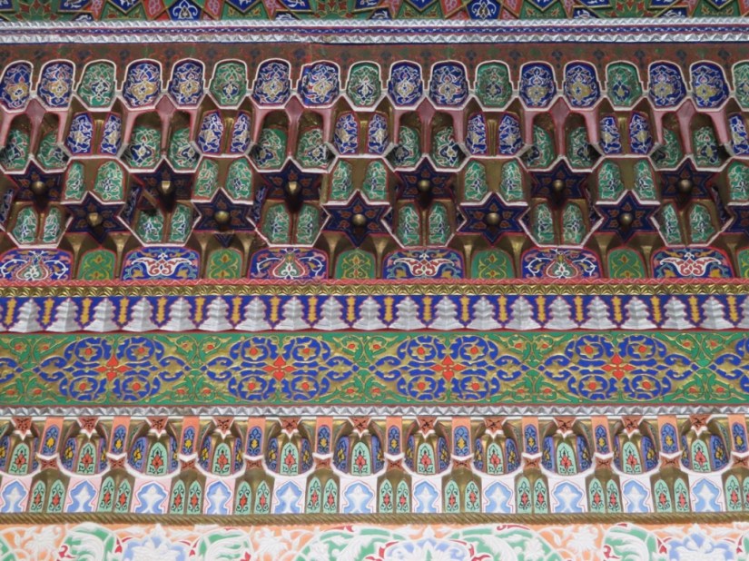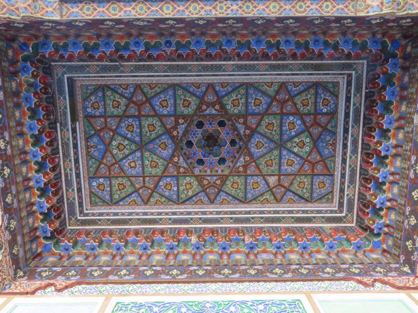 The decoration comprises panels of carved and painted plasterwork called ghanch and ceramic tiles on the walls and typical Tajik style wooden ceilings, also carved and painted. These started in the porch …