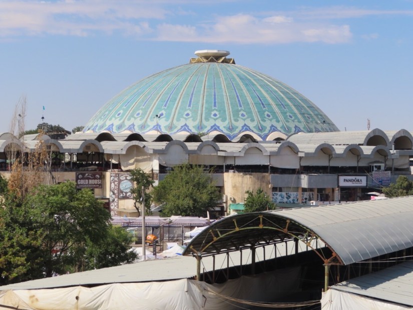 In the C9th roads led from all city gates to the Chorsu Bazaar, bringing traffic and trade to the center of the city. The surrounds would have been a warren of mud-walled houses and workshops, crowded bazaars, mosques, madrassahs and mausoleums. This is Chorsu Bazaar today …