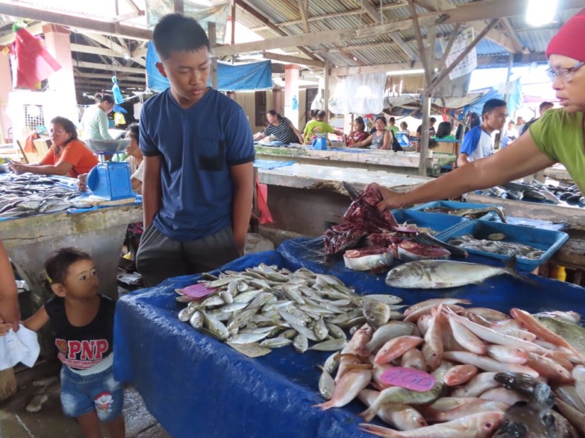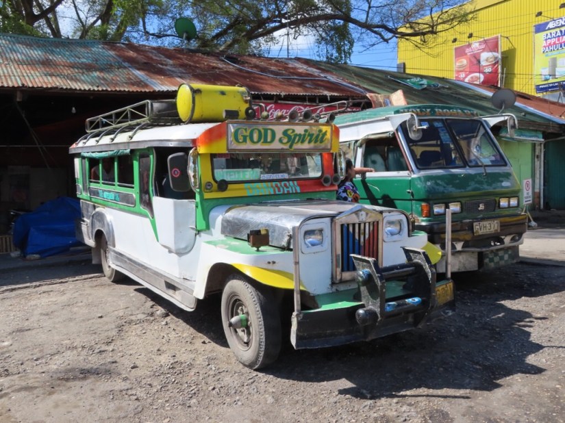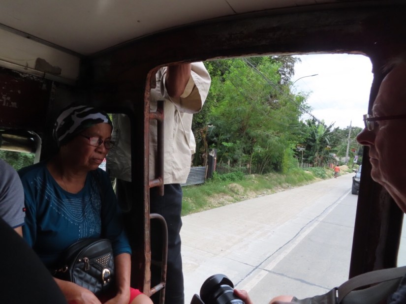 Determined to try out all transport options, next day we headed to the local market and bus station to catch a jeepney. Originally converted from US military jeeps after WWII and decorated with bright colours and chrome ornaments, these minibuses are the most popular means of public transportation in the Philippines. We knew they were crowded, mainly as the routes and fares are fixed, but the driver wants to maximise his income so waits till it is full to leave. Joanna fancied the kitch one, but the slightly more modern one was next in line …