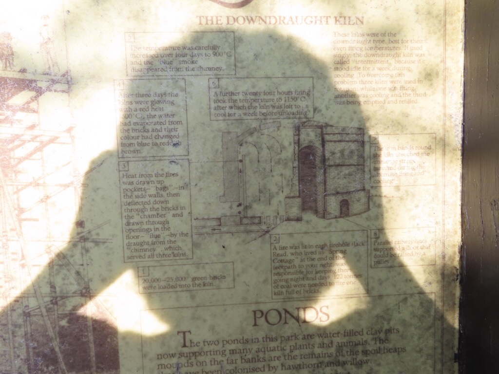 We then made a brief stop to walk into Linford Park to find brick kilns which were in use at the end of the C19th. There was once a tall chimney and the fire would have serviced all three kilns in rotation. They are currently being restored so that the brickwork is safe once more. The information panel had details of the two week firing process which heated the kilns to 1150°C.