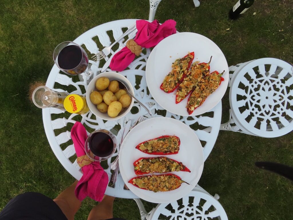 We made short work of stuffing some Romano peppers with artichoke and feta filling and sat in the garden with a glass of wine while they cooked, then thought about how we might spend the next day …