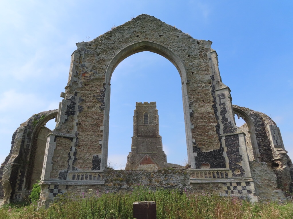 A stop for a walk and coffee and we drove back to Covehithe and parked behind others at the side of a lane. Covehithe was a thriving community with a wealth to rival Lowestoft in the 14th century when St Andrews church was built. Later the river silted up, the population dwindled and the church fell into disrepair and was pulled down except for the tower, and the stone used to build a smaller church within the ruins which has been in use since 1672.