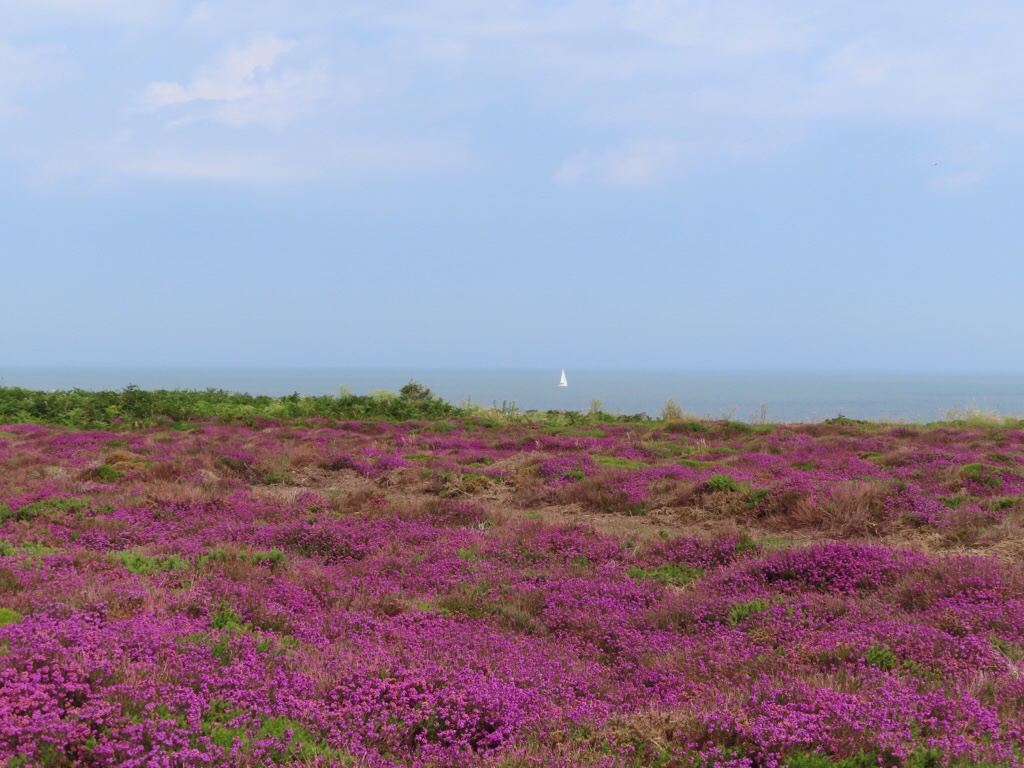 We then headed back into town and were lucky to find a parking space. We did a little deli hopping and picked up a mixture of pies and some local cheese in Slate, a little quiche and a pot of mixed salads in the Black Olive and some beer and wine in Adnams. We returned to put it all in the fridge, had coffee then set out to the National Trust site at Dunwich where various walking routes lead through the heathland bordering the coast. As we arrived, we realised there was an added bonus as there were swathes of bright purple bell heather in bloom.
