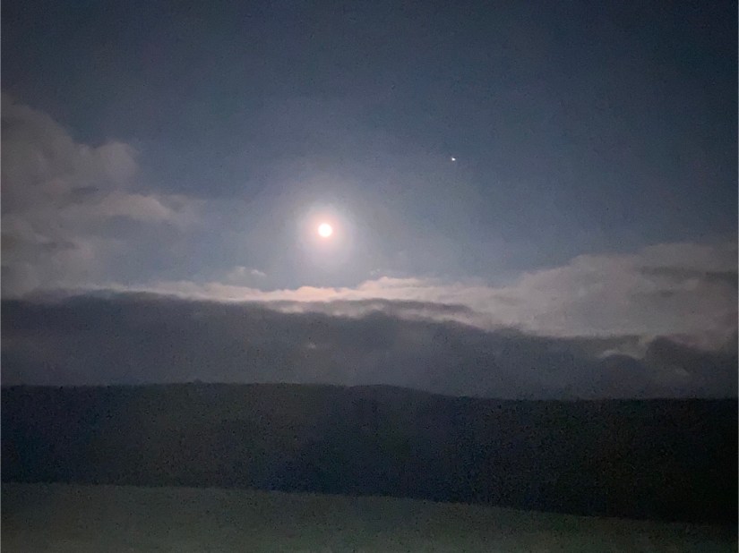 Shortly after, the cloud came over, but we had seen more than I thought we would, I just thought the images would be bigger through the telescope. The sky cleared on the way back, and I took this with my phone with Jupiter beside the moon. By the time we got back it was gone 11.00, well past our bedtime!