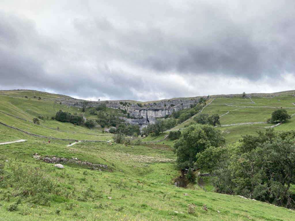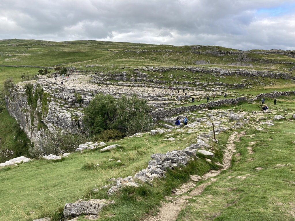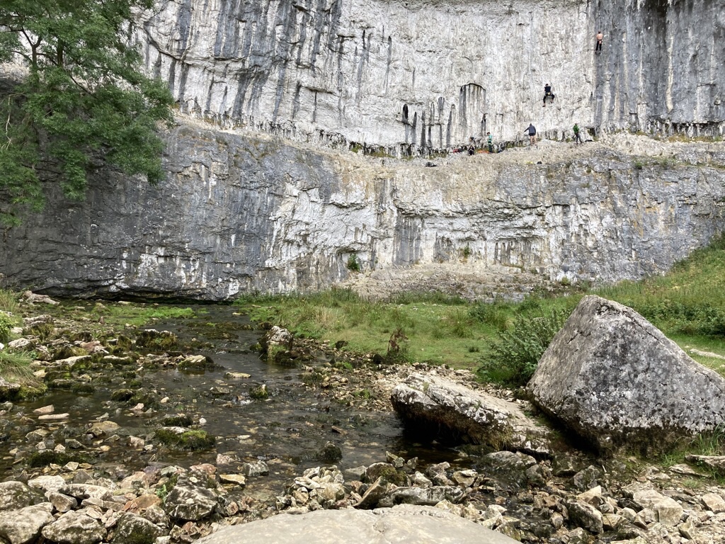 Malham Cove is apparently the most popular walk in the Yorkshire Dales and why not, when according to one story it is a giant hoof print made when the Norse god Odin was riding his horse Sleipnir! It has been attracting visitors for centuries, with painters such as JMW Turner promoting the area further. It’s a popular spot, but there was ample car parking and plenty of space for everyone. We took the footpath through the village and across the fields to Malham Cove, a huge limestone amphitheatre shaped cliff and sat on a rock and ate our sandwiches pondering the fact that this would once have been a huge waterfall. Today there is a small underground stream that emerges at its foot and becomes the Malham Beck. Above were climbers attempting ascent of the rock face.