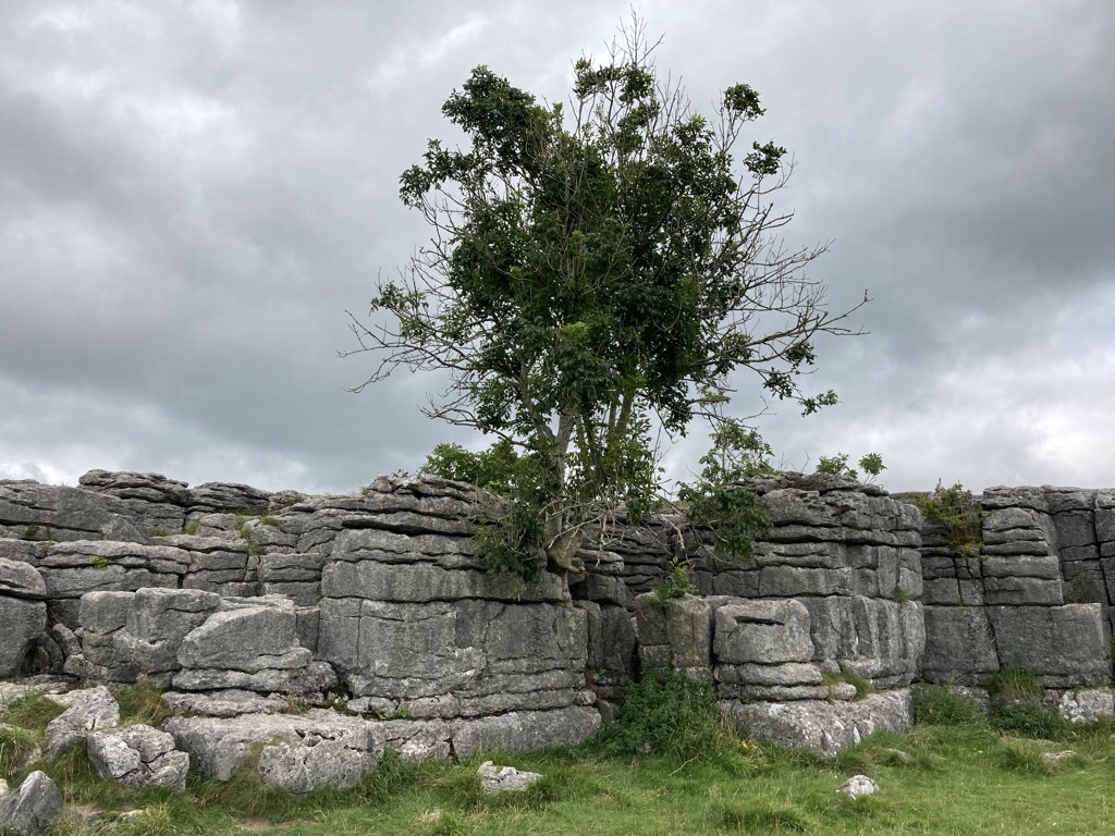 The top of the cove is a large area of deeply eroded limestone pavement, where slightly acid rainwater has gradually dissolved the rock along faults and cracks.