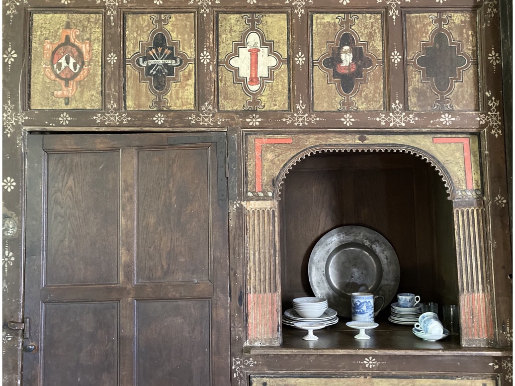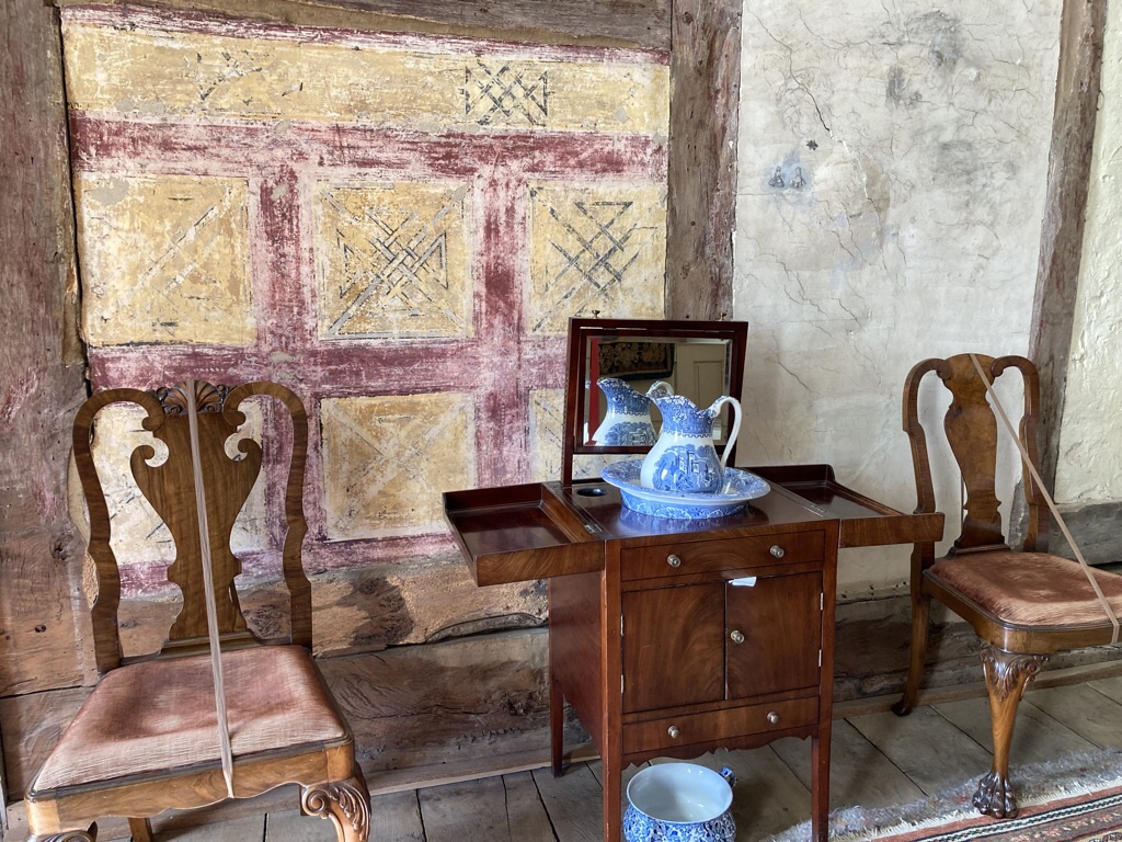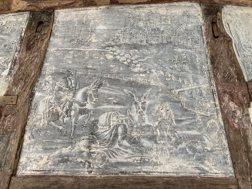 During restoration in 1990, these painted murals showing a scene from the story of Jeroboam which date to around 1600 were revealed.