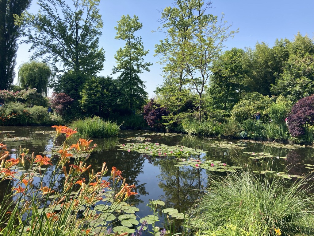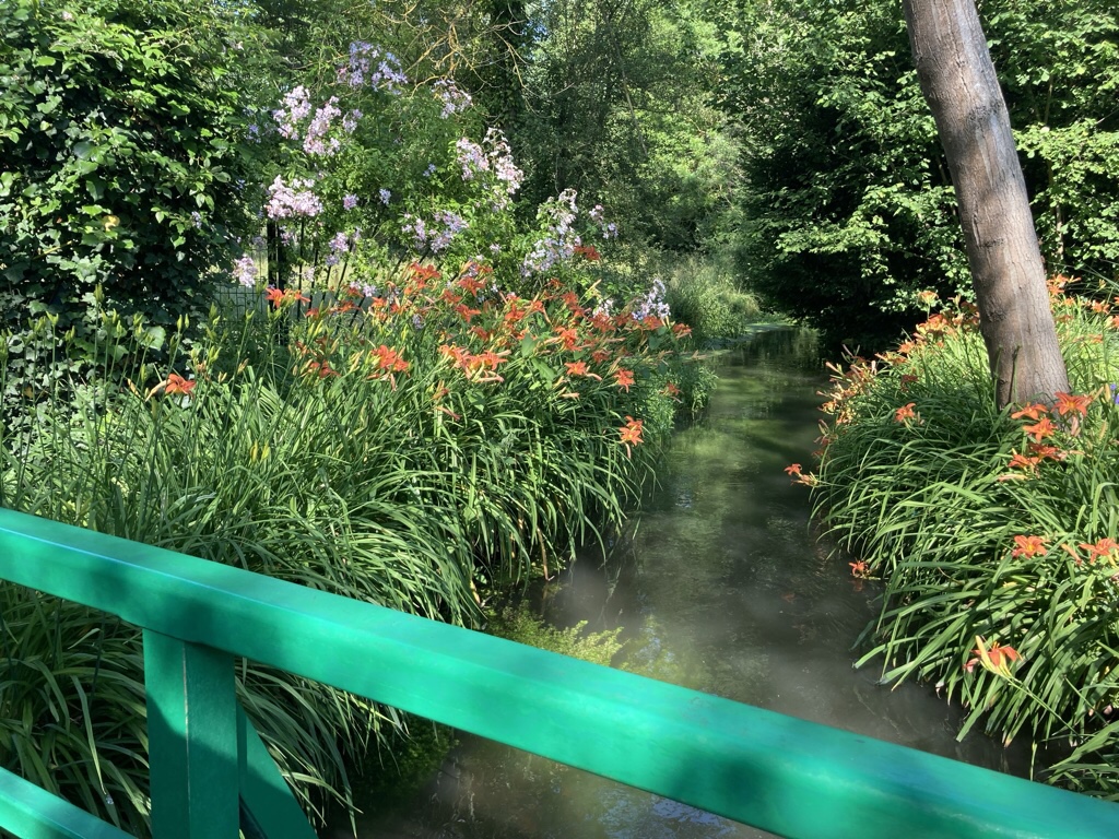 After sampling the excellent bakery items further for breakfast, we returned to Giverney for our 10.30 entrance to Monet’s home and garden. We didn’t quite beat the crowds, but someone mentioned it was a quiet day and we took it all in our stride. The route led us first under the road to the extra piece of land Monet purchased in order to make his water garden. Immediately, there is a lushness and an oriental feel with bamboo and willow providing a background for vivid orange lilies …