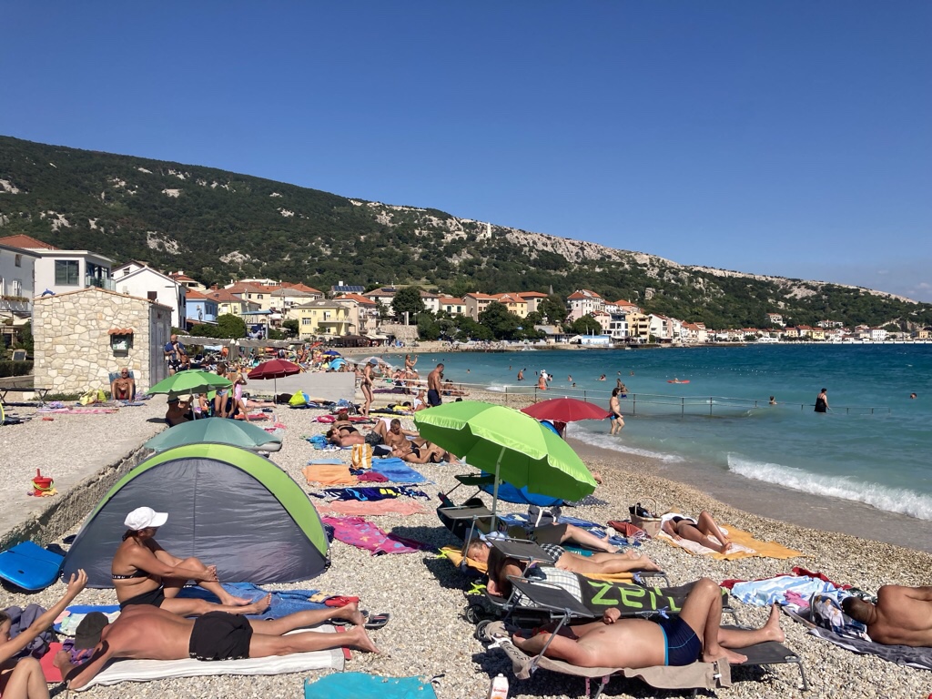 We could have lingered, but after running out of time for a dip yesterday, the beach is calling this afternoon! We drove across the island to Baska which is famed for the Baska tablet, found here in 1934. The stone dates to the C11th and is written in Glagolitic script, recording King Zvonimir’s donation of a piece of land to a Benedictine abbey and how the church was built by the abbot and nine monks.
