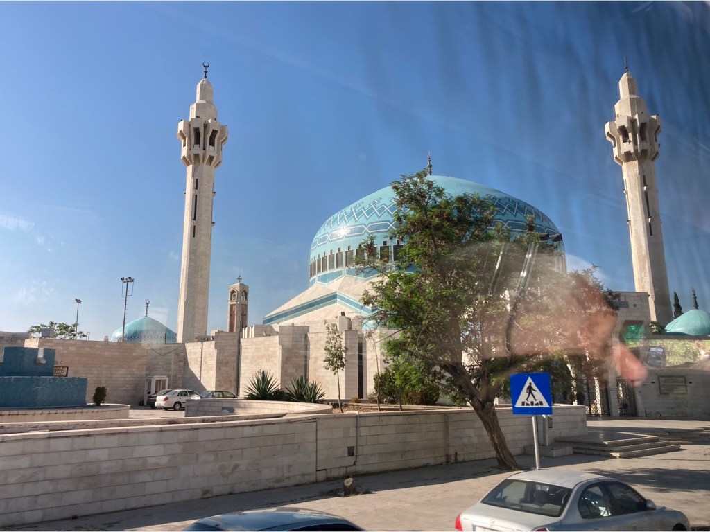We arrived yesterday in time for a late dinner and woke to a lovely sunny day here in Jordan. We greeted fellow travellers as 30 of us boarded the coach for our day trip to Jerash. We began with a brief drive through the old and new parts of Amman and snaps were difficult, but here is the King Abdullah I Mosque, completed in 1989 and the only mosque in the city open to non-Muslims, with its sky blue dome and quasi-Brutalist minarets.