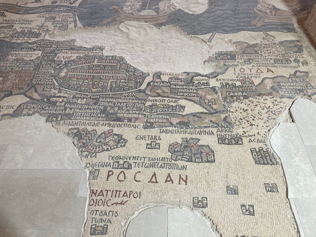 This morning we packed our bags and set off for Madaba to see the oldest mosaic map in the world. In Byzantine times, there was a large Christian community in Madaba and St George’s Church was built with an impressive mosaic floor. This building was long gone when a new church was to be built in the C19th and the mosaic map was discovered, unfortunately damaged.