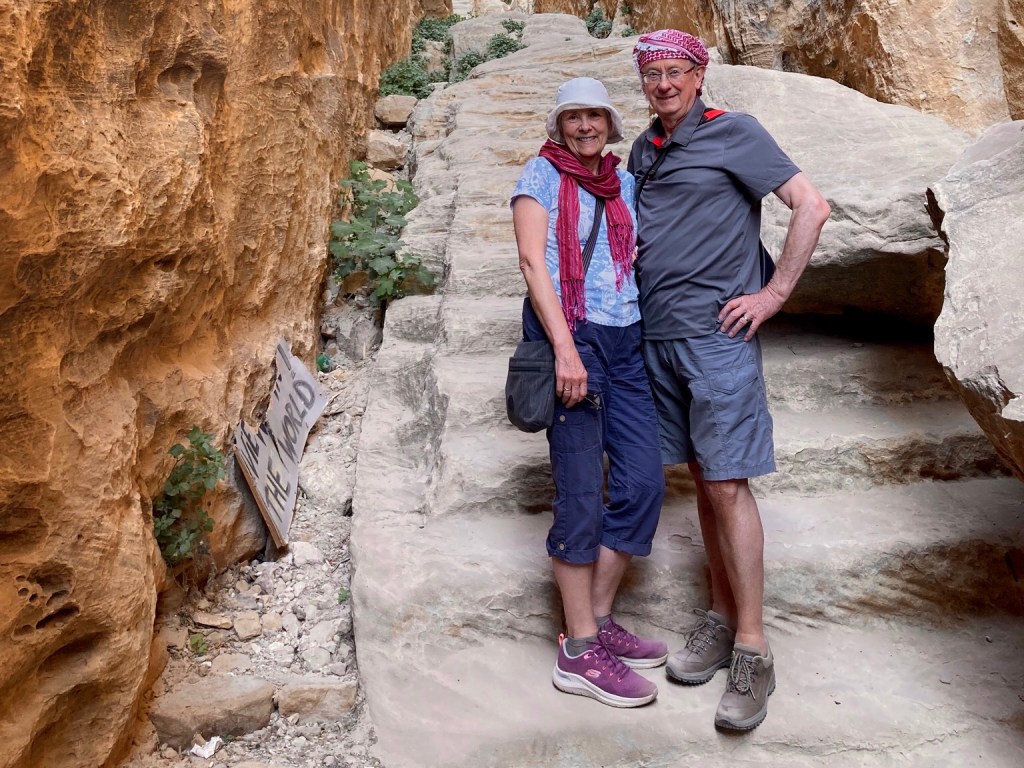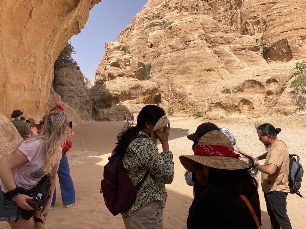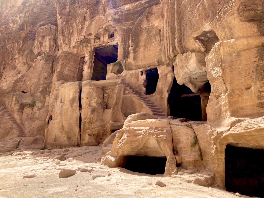 The wind had got up today, a warm wind from Egypt which whipped the sand up into flurries as we approached the small gorge at Little Petra which was likely to have been used as a caravanserai for visiting traders on the Silk Road.