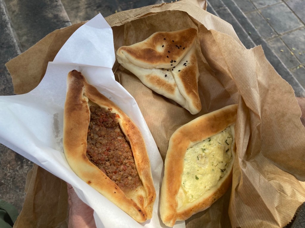 Unfortunately, by the time we were ready to eat, Hashems, the most famous falafel cafe in Aqaba, even visited by the King of Jordan, was closing. Instead we stopped a couple of doors down at a bakery selling small Middle Eastern pies with different fillings – meat, cheese and hot potato among others, some open and others closed, that are heated up in the bread oven – a bargain, 3 for 75p!