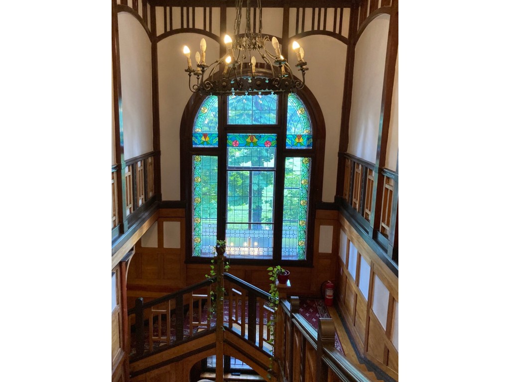 … with wood fittings and stained glass.