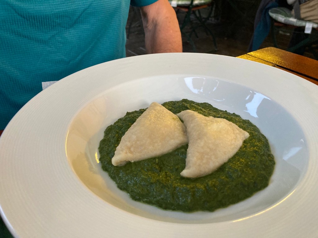 Chris had Transylvanian dumplings stuffed with cheese in a spinach purée …