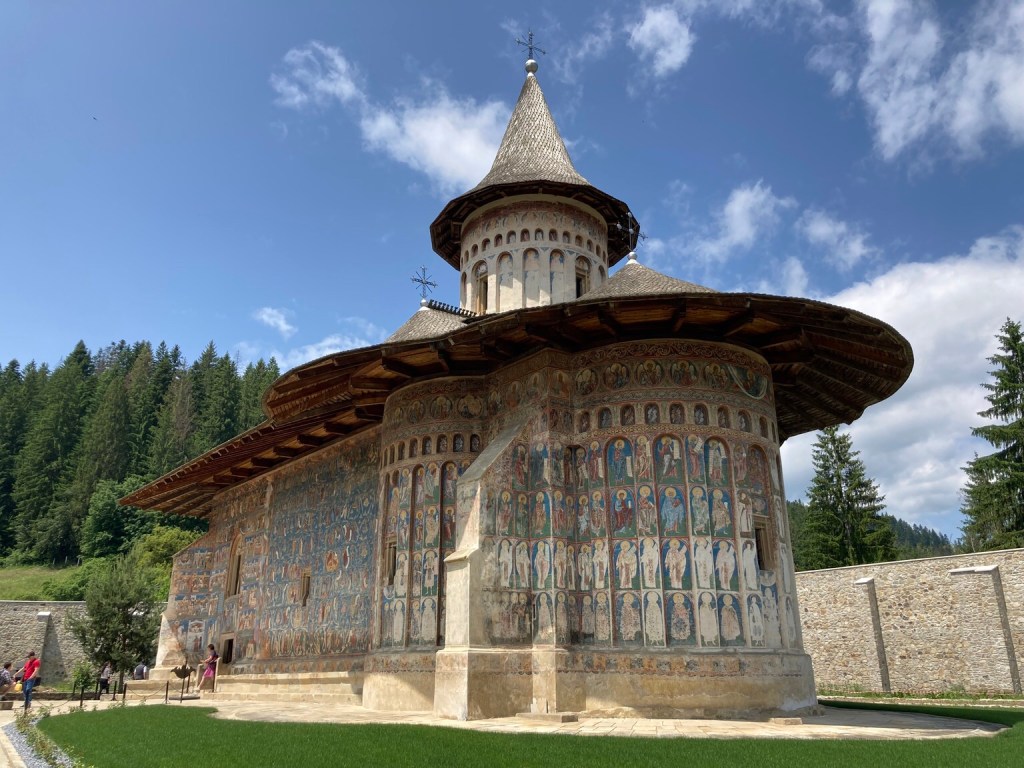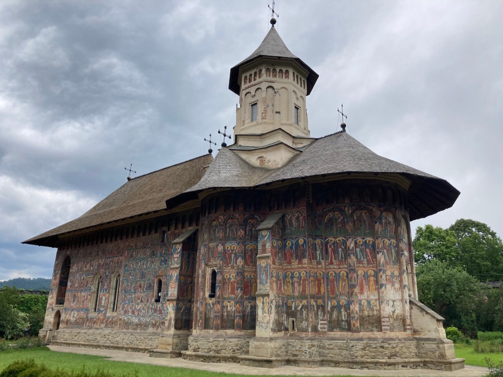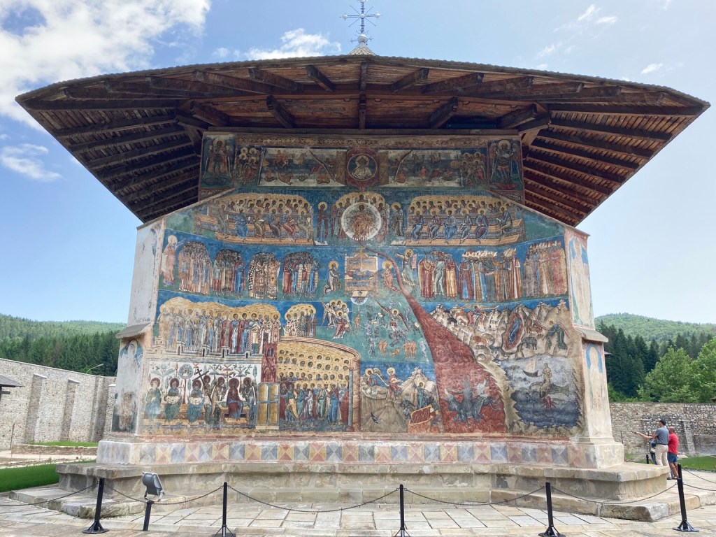 Voronet was built in 1488 for Stephen III of Moldavia to celebrate chasing the Turks from Wallachia and is considered the jewel of Romania’s painted church crown. We entered beside the north wall, where the frescoes have largely been worn away by weather …