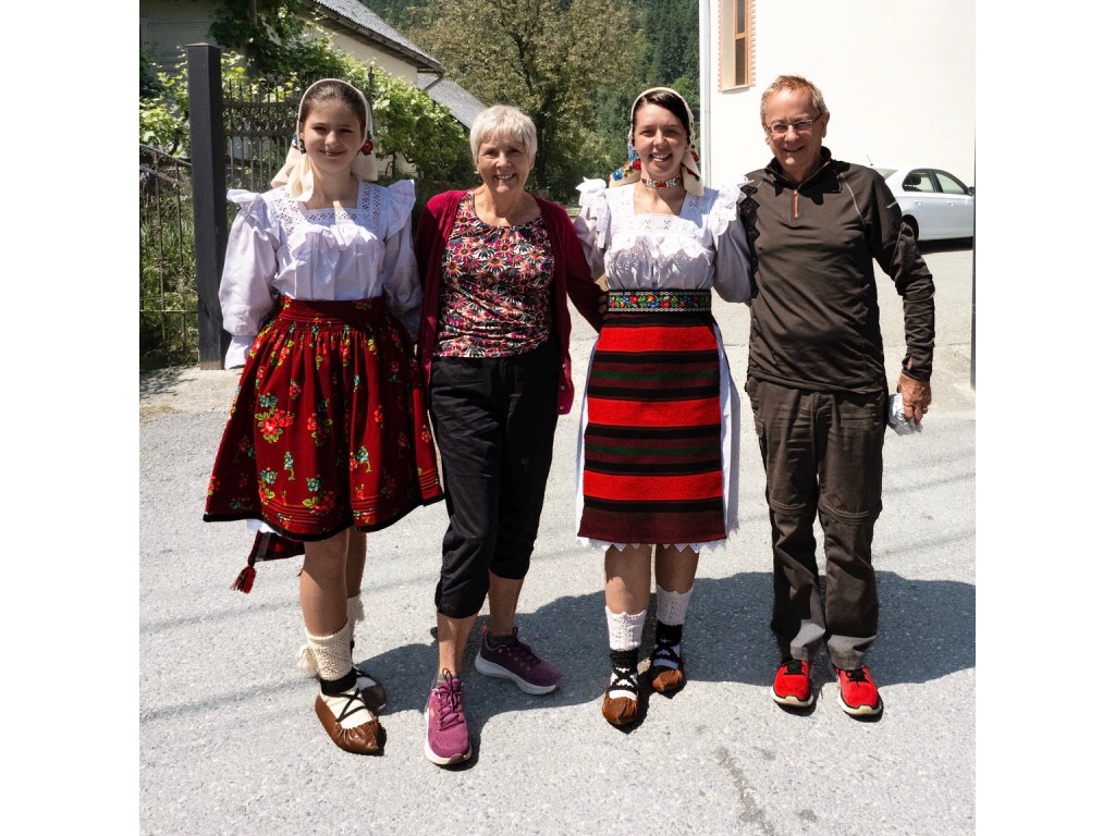 As we drove on we saw more people in traditional dress and when we slowed the car beside one group, the lady in the striped skirt spoke good English and explained she was a bride to be married in a month, so she was in a special wedding outfit. Her grandmother had embroidered her belt, and everything is handmade, including the stockings and leather shoes called opinci. She asked if we would like a photo and here it is!