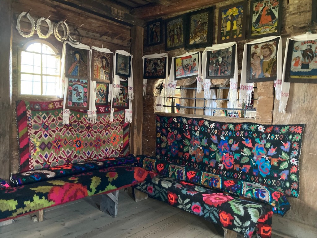 This church was charming and seemed to still be used. We were allowed to take photos, so here is the outer room lined with rug covered benches and decorated with adorned icons …