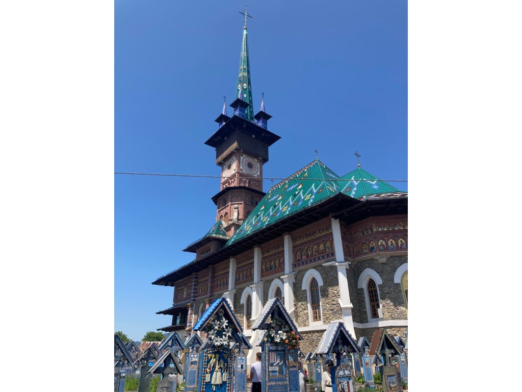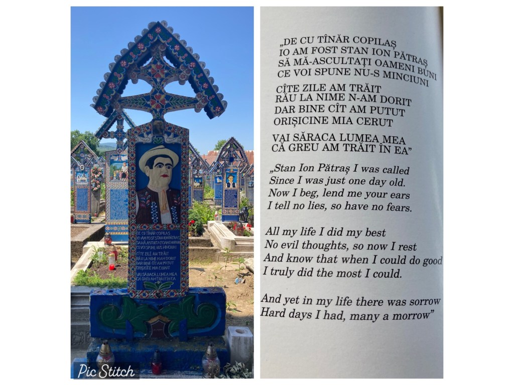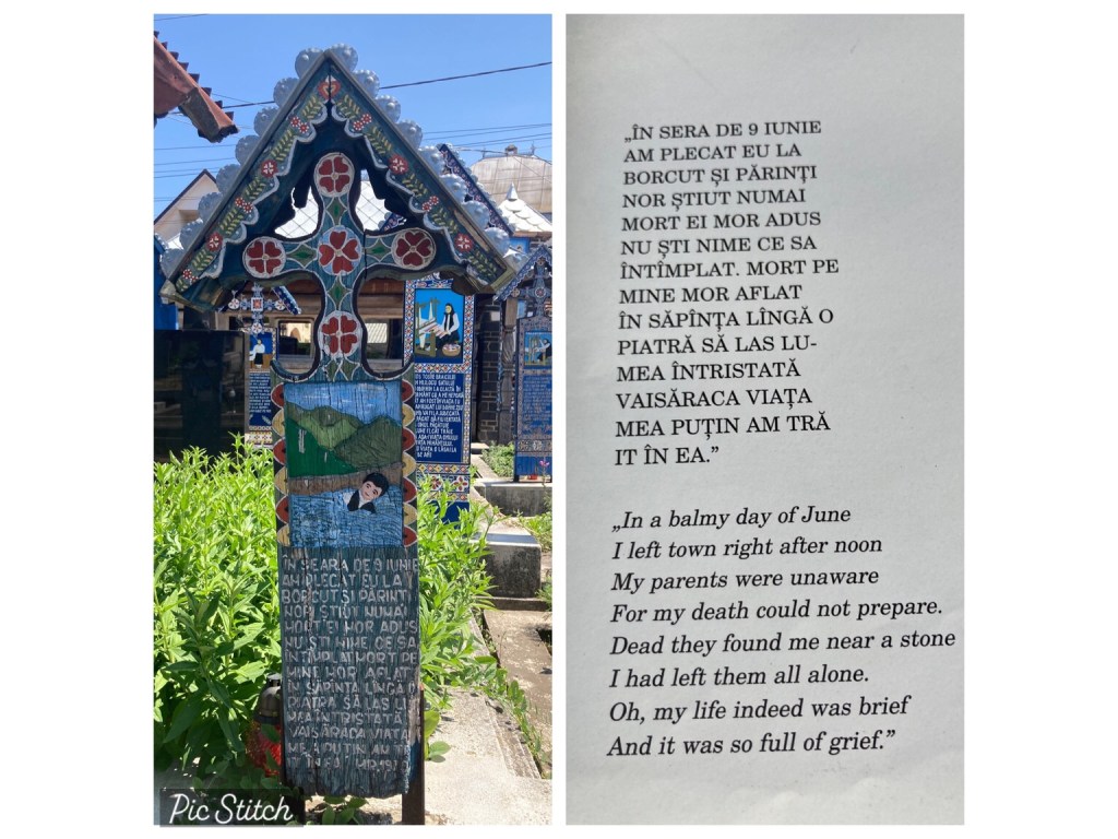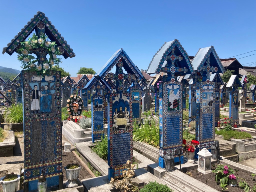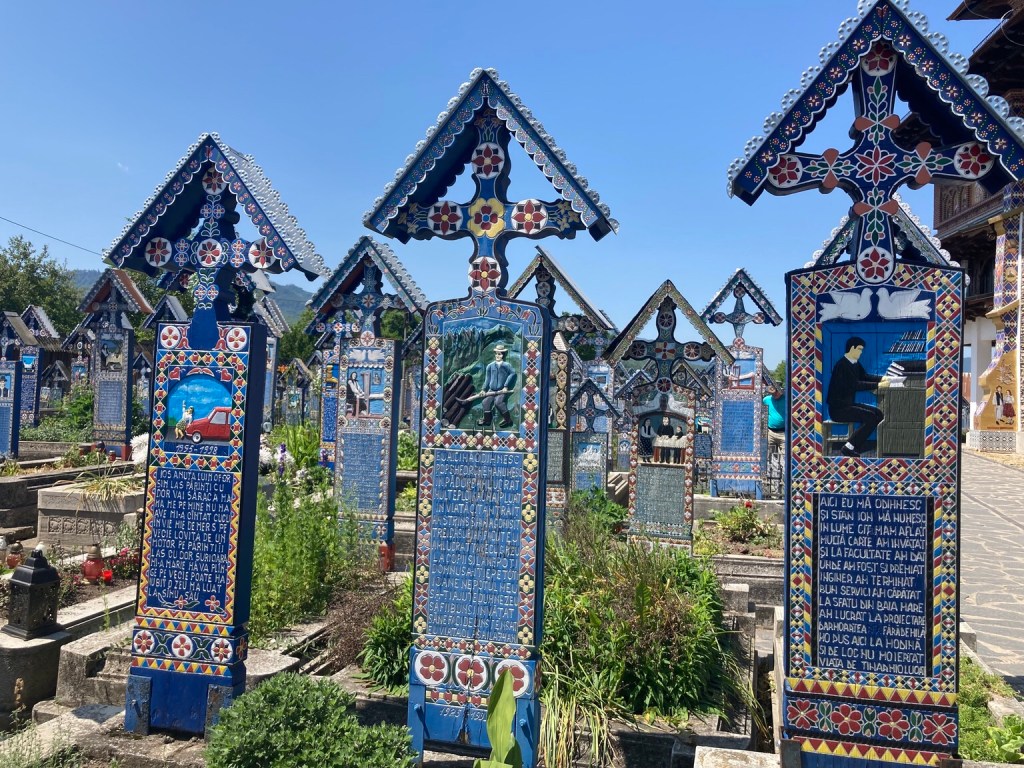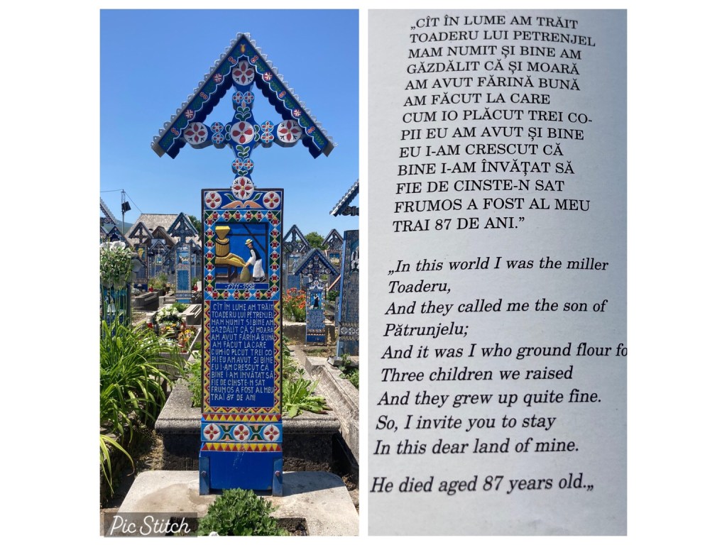 … we set off to Sapanta to visit the Merry Cemetery, famed for the work of the woodcarver Stan Ion Patras who spent his life making painted wooden grave markers, with pictures of the deceased or a scene from their life and a short rhyme.
