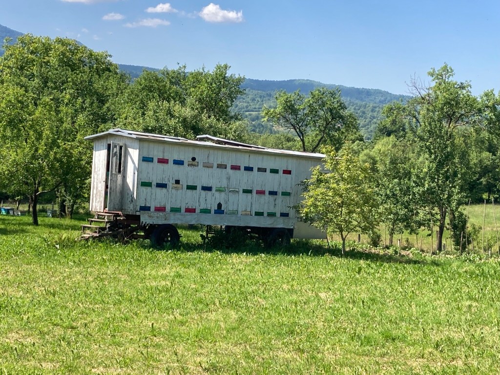 Finally beehives, not just individual ones sitting in a field, but caravans and lorries containing rows of beehives, easily portable to go where the flowers are!