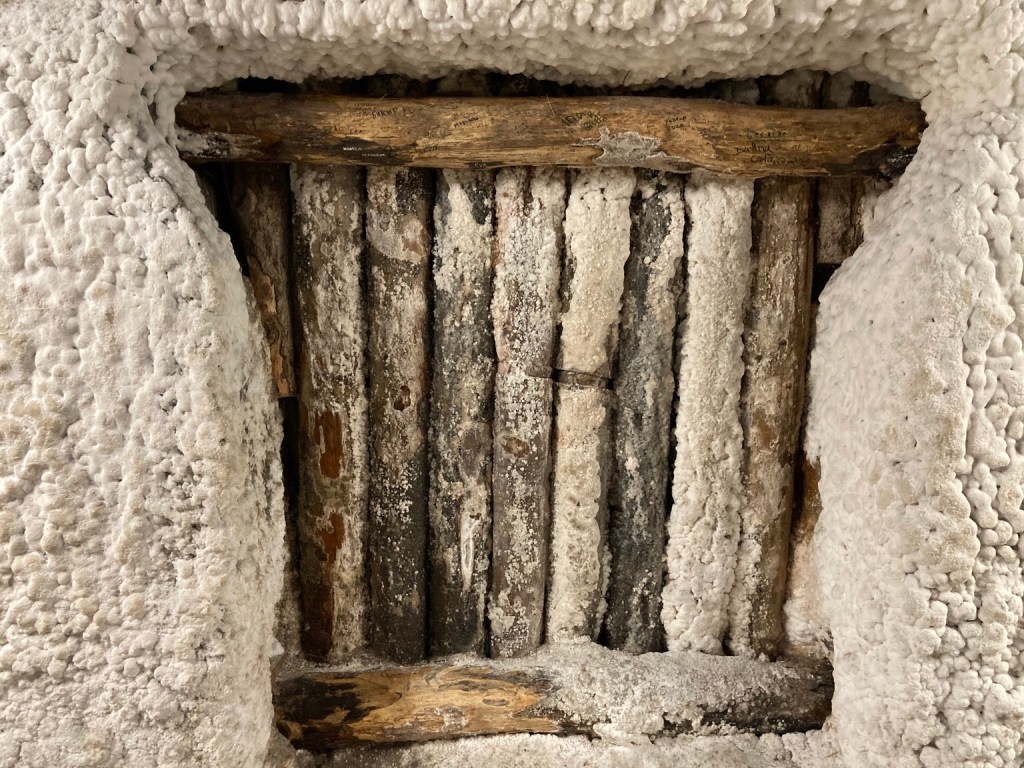 We reached the top of the Rudolf Mine and saw the rough surface of the salt ceiling glistening and the lit zig zag of the flights of stairs opposite heading downwards.