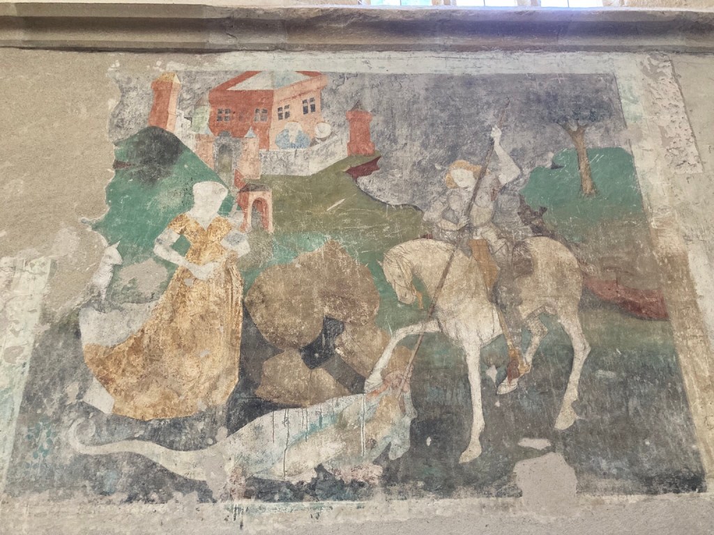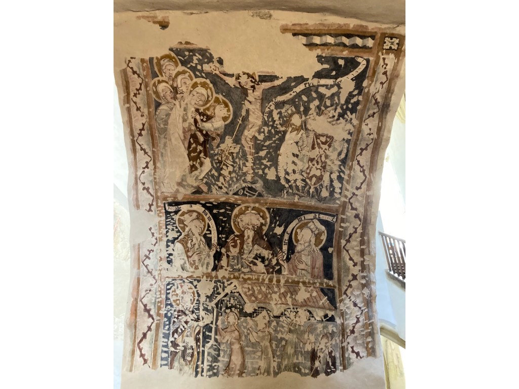 Restored fragments of murals from the late C15th include this rare image feintly showing God with three heads depicting father, son and Holy Spirit in the centre …