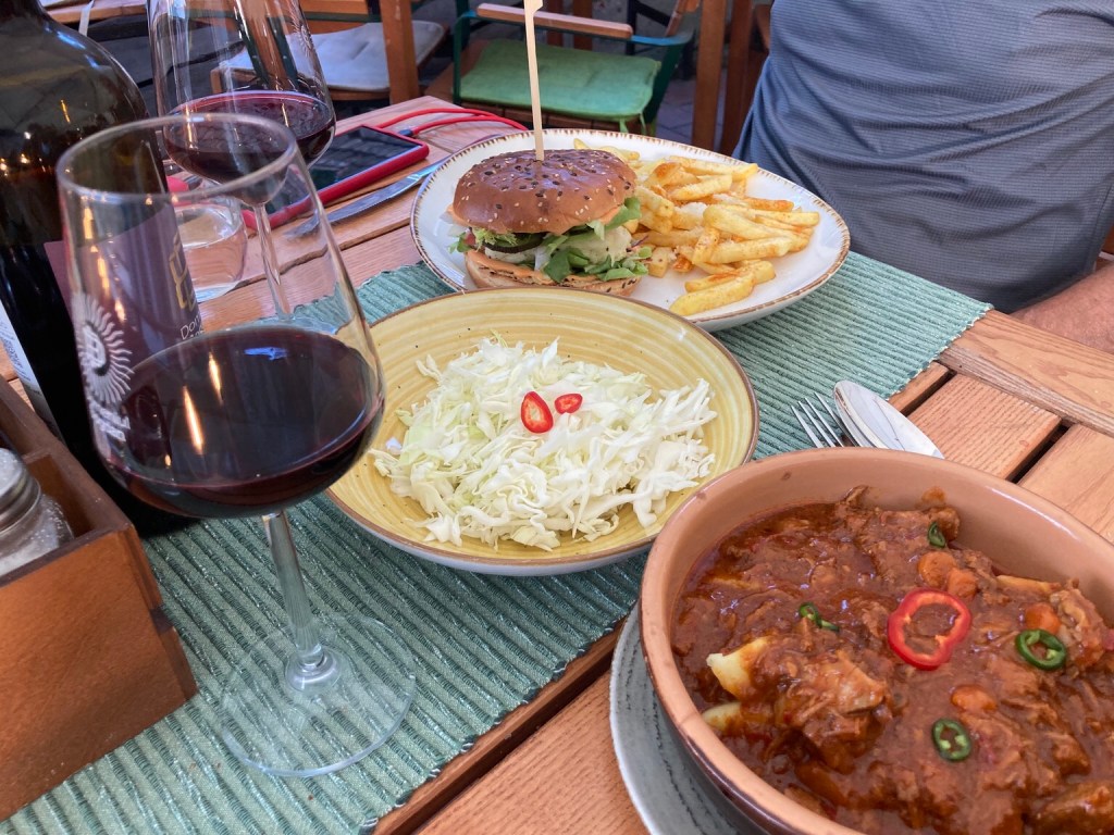 … and dinner, Chris finally succumbing to his first haloumi burger, while I had amazing goulash.