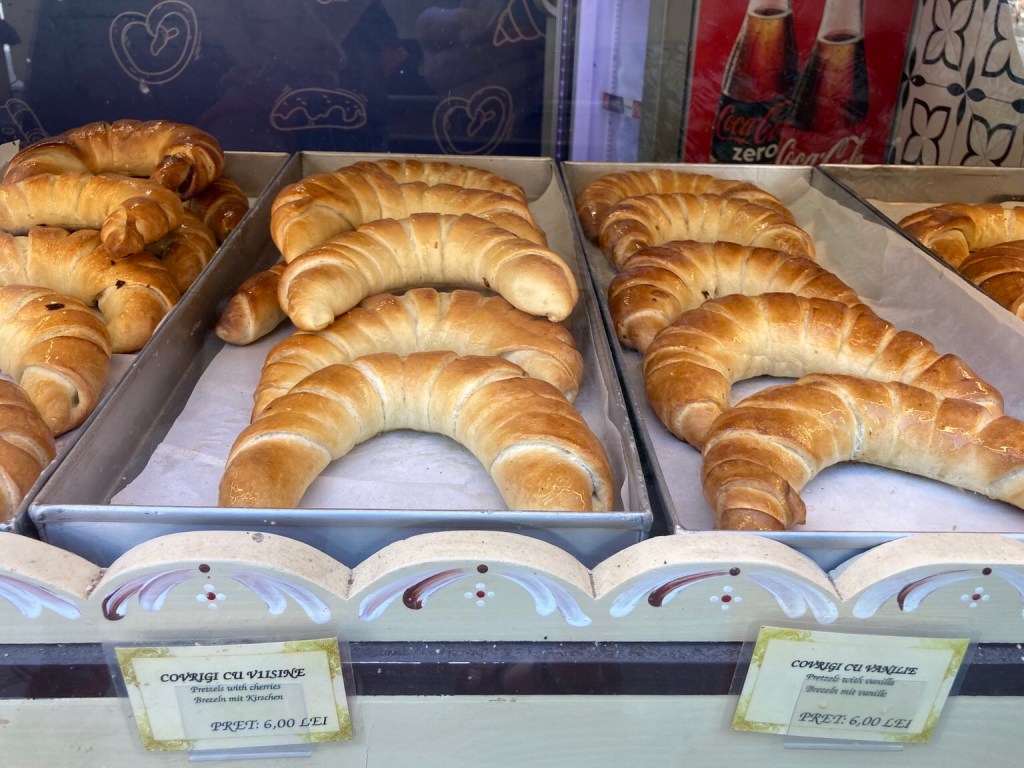 An early start was required, so having admired the choice of covrigi, gogosi and poale’n brau in the bakeries, we bought a selection for breakfast before we left.