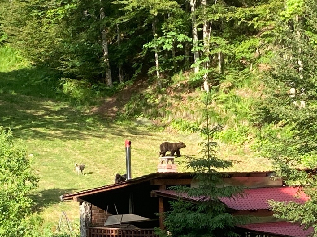 We were sitting on the balcony before dinner and the resident dogs started barking. When we looked, a bear had come out of the forest and was eating something.