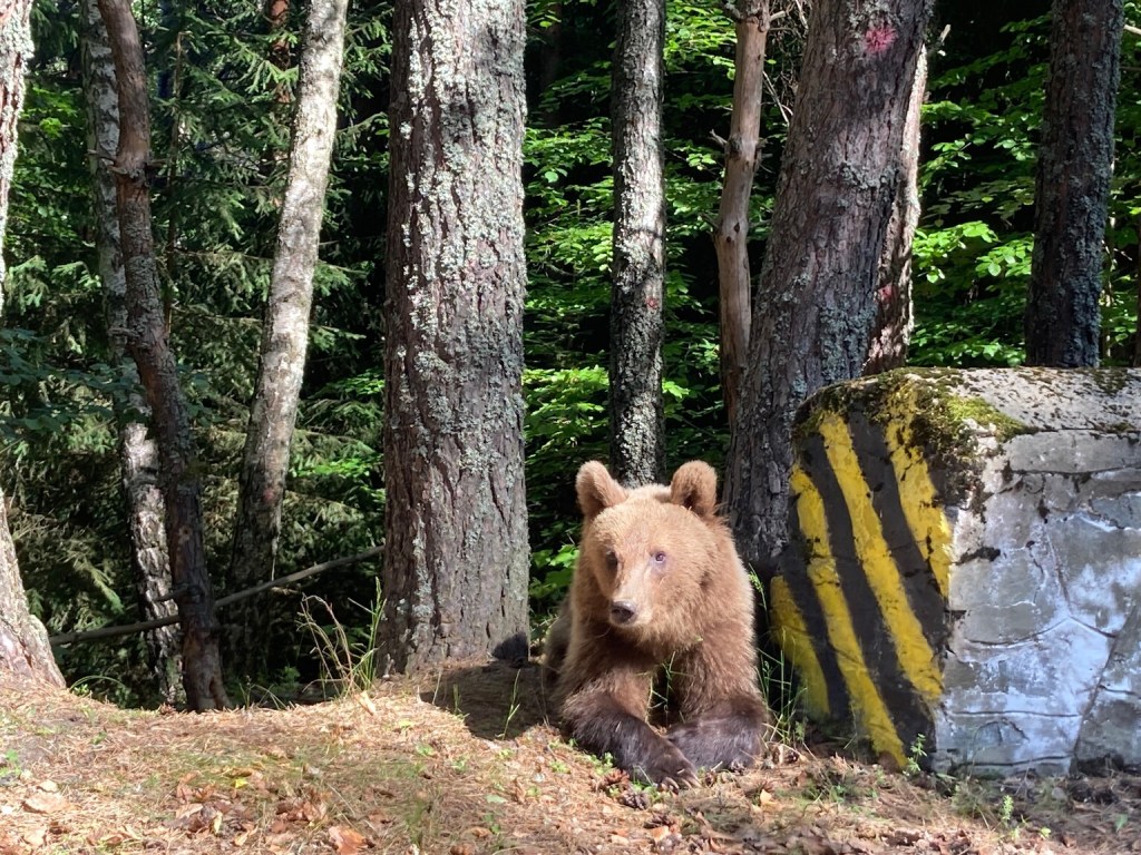 In the morning the road meandered alongside a stream and through the forest for some time and we kept an eye out for bears. The first we saw was sitting behind a wall by the road soaking up the sun and paying us little attention as we took several photos and with no traffic behind us, we were able to watch him for a few minutes. He did look quite chilled and unbothered by us and was a joy to watch.