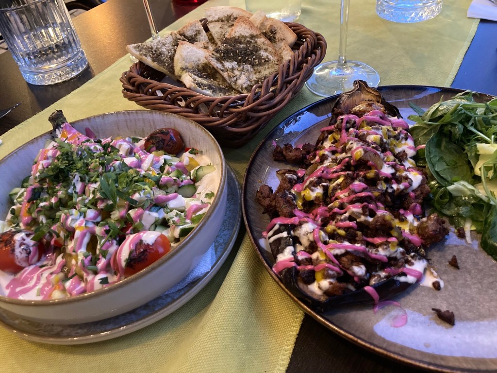 We were looking for Aubergine, which proved fairly quiet and a great choice for our last night – one Eggplant Pot and one Eggplant with Beef with crispy pita with za’atar and wine …