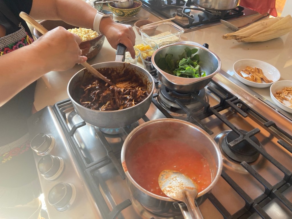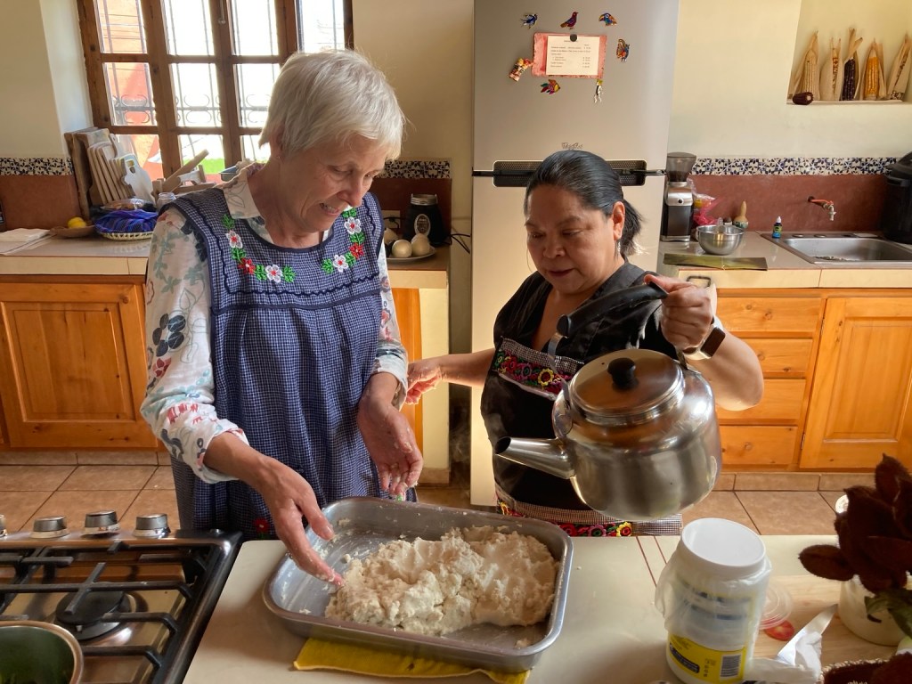 We were cooking three varieties of tamales – one flavoured with a herb called chipilin, containing a little red salsa and a cube of cheese, another with homemade mole with oyster mushrooms and a prune, and a dessert one mixed with cinnamon, chopped pineapple, raisins and some grated coconut.