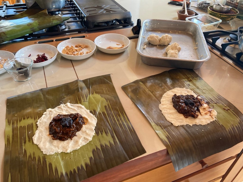 It was then time to start building the tamales, carefully encasing the filling in dough and wrapping them.