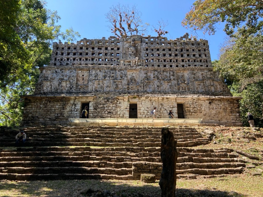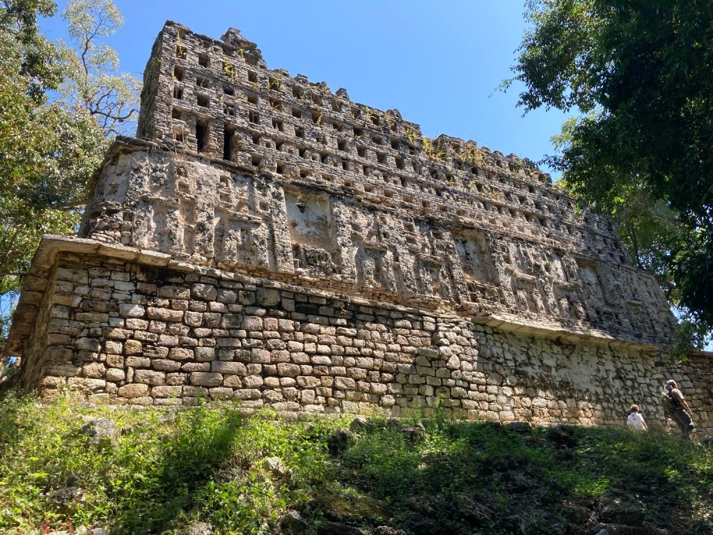 Pierced stone structures called roof combs features on several buildings here, a decorative effect to add height and prestige. At the center of the roofcomb was once a gigantic figure of Bird Jaguar wearing an enormous headdress, although it is difficult to make out now.