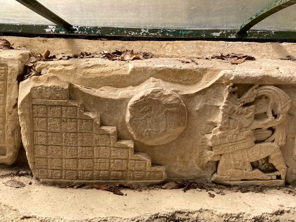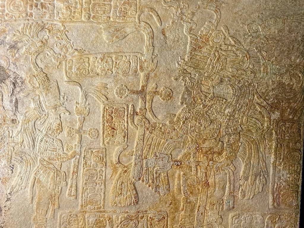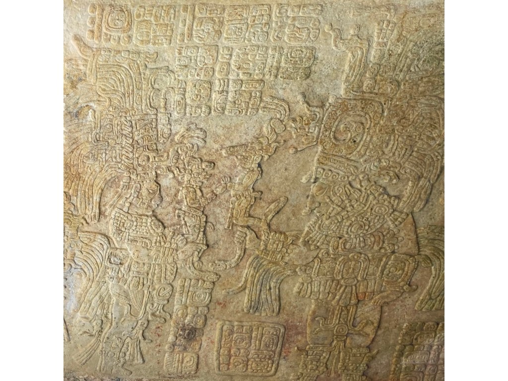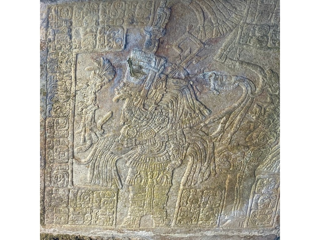 The underside of the doorway lintels are carved, each showing Bird Jaguar IV in a dance ritual. The first commemorates his accession to the throne, wearing a wild headdress and with his wife, the Lady Great Skull behind him.