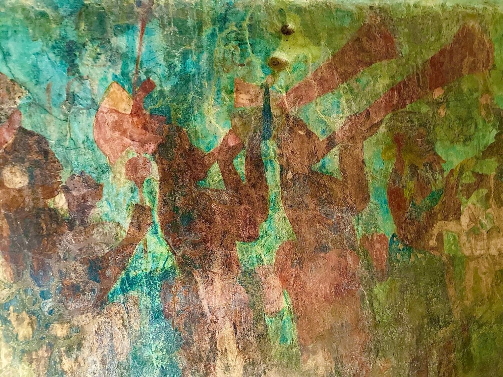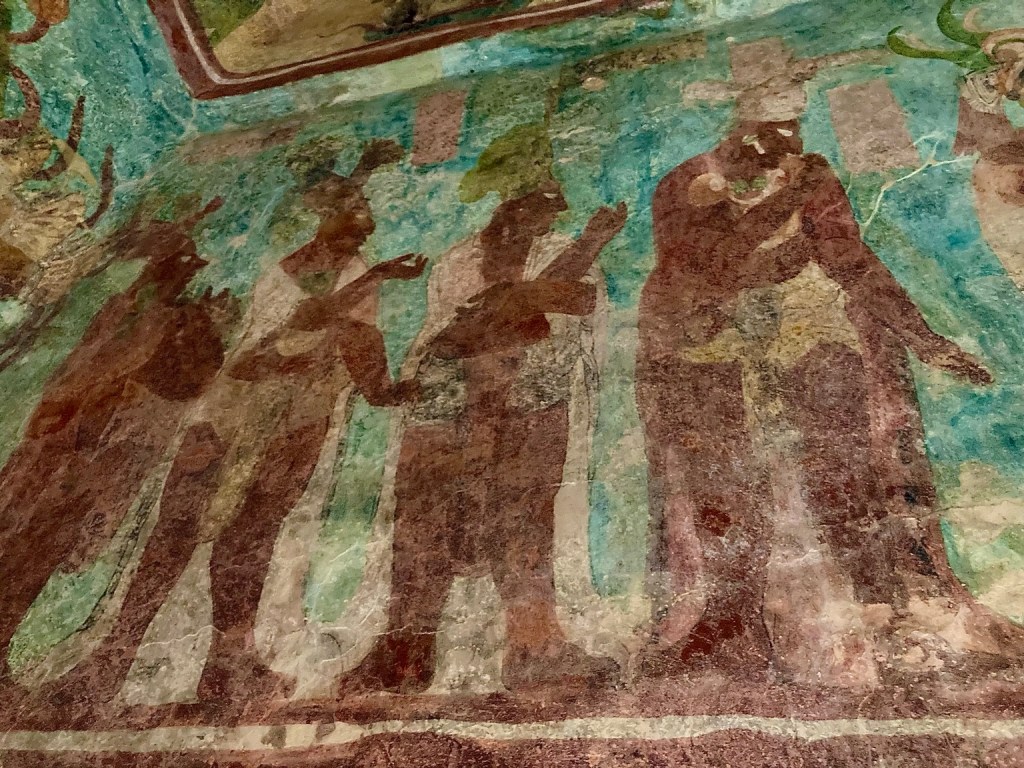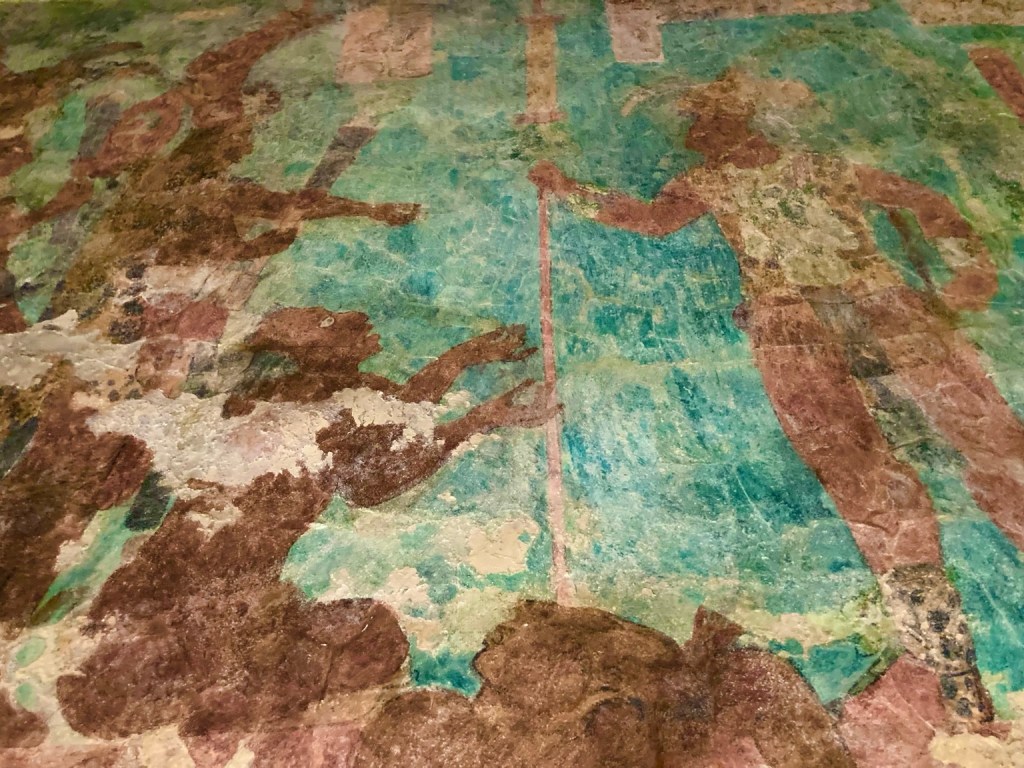 It seems that a trick of nature is responsible for the survival of these murals as over time, calcium rich water seeped into the building and deposited a coating of crystallised calcite to seal the fresh colours beneath. Specialists in the 1980’s, meticulously removed this layer and stabilised the murals but there is a twist to the tale. Apparently good was not enough, and visitors subsequently sprayed kerosene on the images to brighten them for photos, until it was realised it was causing damage!
