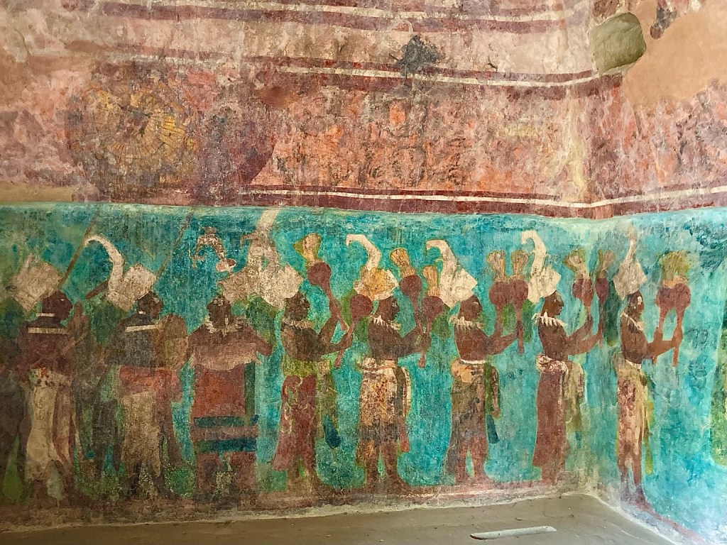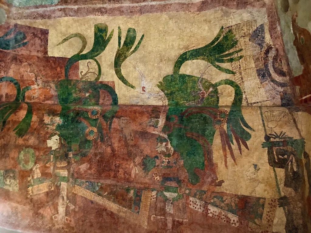 This whole area is the homeland of the Lacandon people, the same indigenous community that the owners of Casa Na Balam in San Cristabel had worked with. The Lacandon continue to be guardians of the forest and we transferred to their transport for the last stretch to Bonampak. We walked through the forest into the grand plaza with several buildings ahead, but the only interesting one was the building under a cover to the right with three rooms.