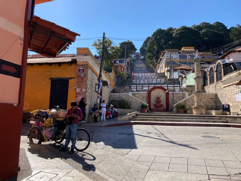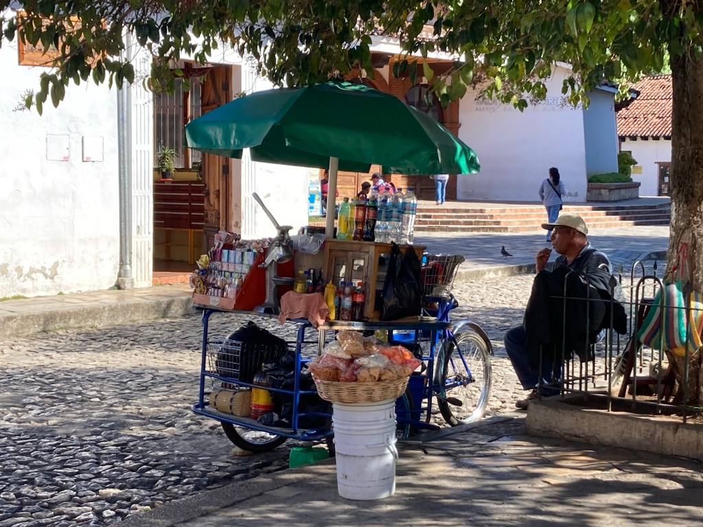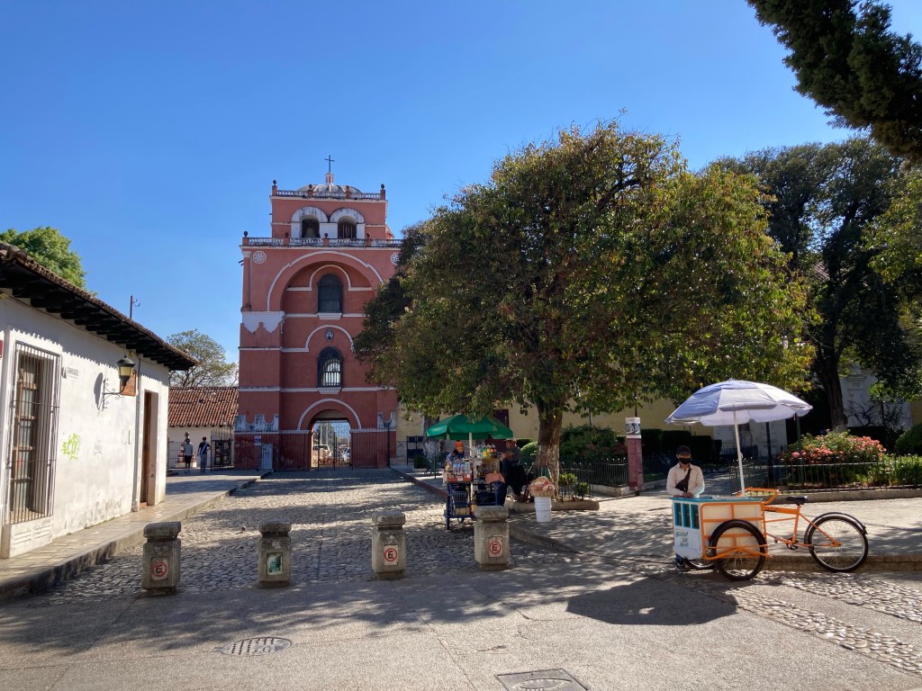 We left our luggage and had a coffee with some pastries we had bought in case we were peckish. We couldn’t check in properly till after lunch, so it was a perfect time to go on a walking tour of the town with Voy a Chiapas. We met at the cross in the middle of Plaza de la Paz right in front of the Catedral de San Cristóbal Mártir …