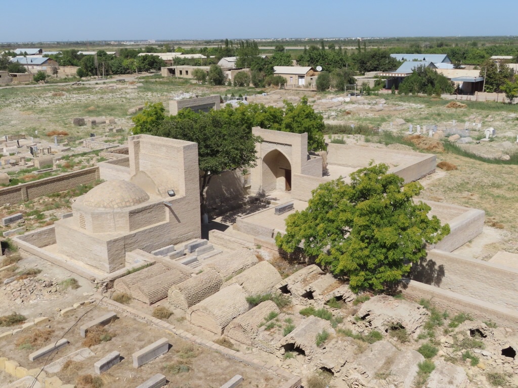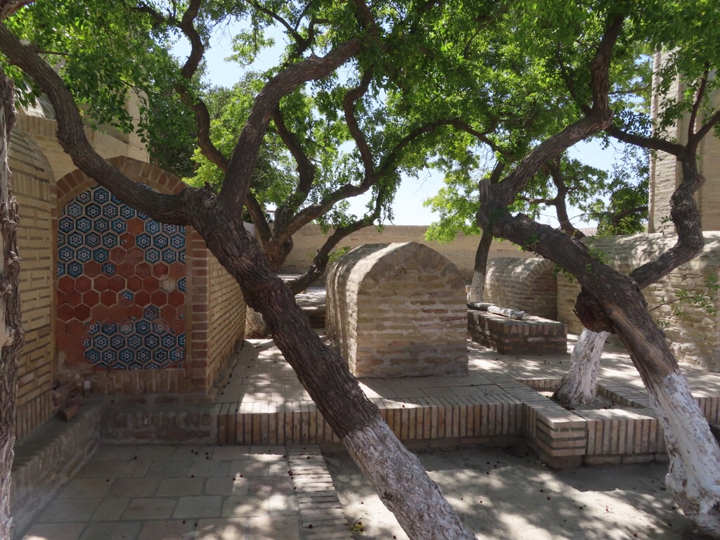 The Chor-Bakr Necropolis was built in the C16th, although it was already established as a burial ground. The main complex has two mosques, pool and later minaret. We went up on the roof for views … including this rather Impressionist snap of the Kalyan complex in the distance.